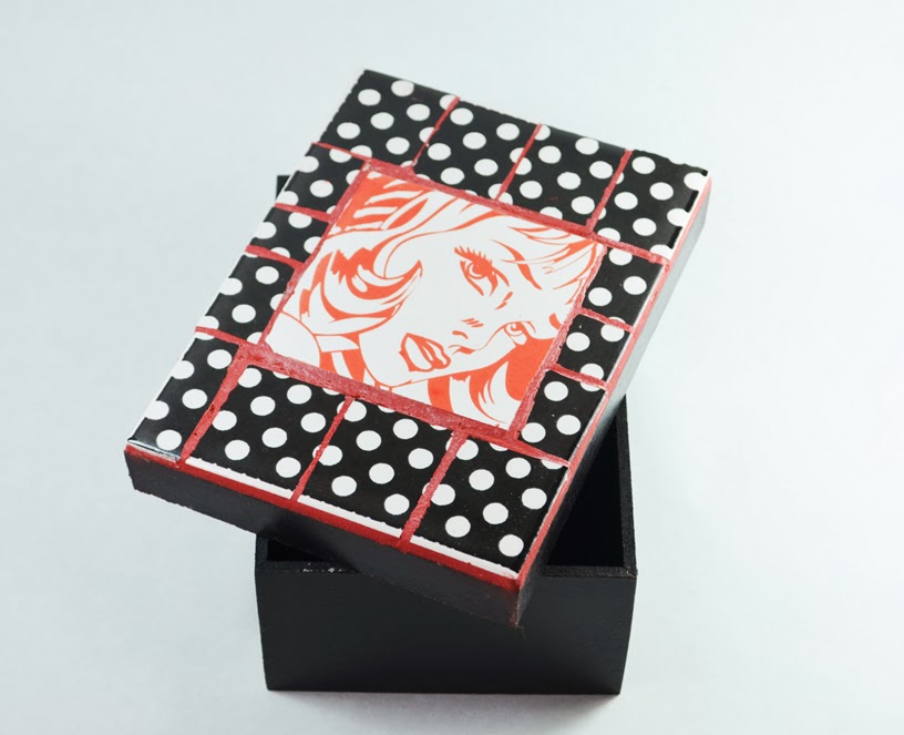 En la tapa de la caja se puede apreciar la imagen de una reconocida obra de Roy Lichtenstein, enmarcada por azulejos partidos con diseño de lunares. Intervenida con piezas de 15cm por 10cm, de fibrofácil y pintadas a mano con esmalte sintético.