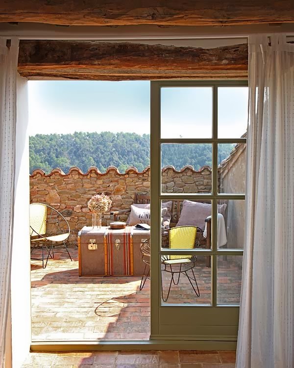 La terraza del salón, antiguo secadero, está protegida entre los tejados de la casa y ofrece maravillosas vistas a las montañas de Les Gavarres. A ella se accede a través de grandes puertas corredizas, pintadas en un verde aceituna que se funde con el paisaje.