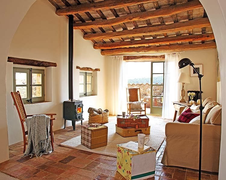 Las vigas y el solado de barro aportan autenticidad al salón, fiel al estilo rústico. En su decoración, priman las texturas naturales, que ganan relieve con la intensa claridad. En el centro, una alfombra aporta calidez y, junto a las paredes, ofrece una gran superficie que aumenta la luminosidad.