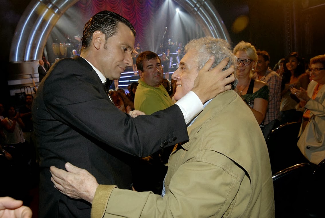| Bossi anoche agradeciendo la presencia de Antonio Gasalla. Público de pie ante. |