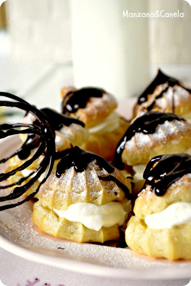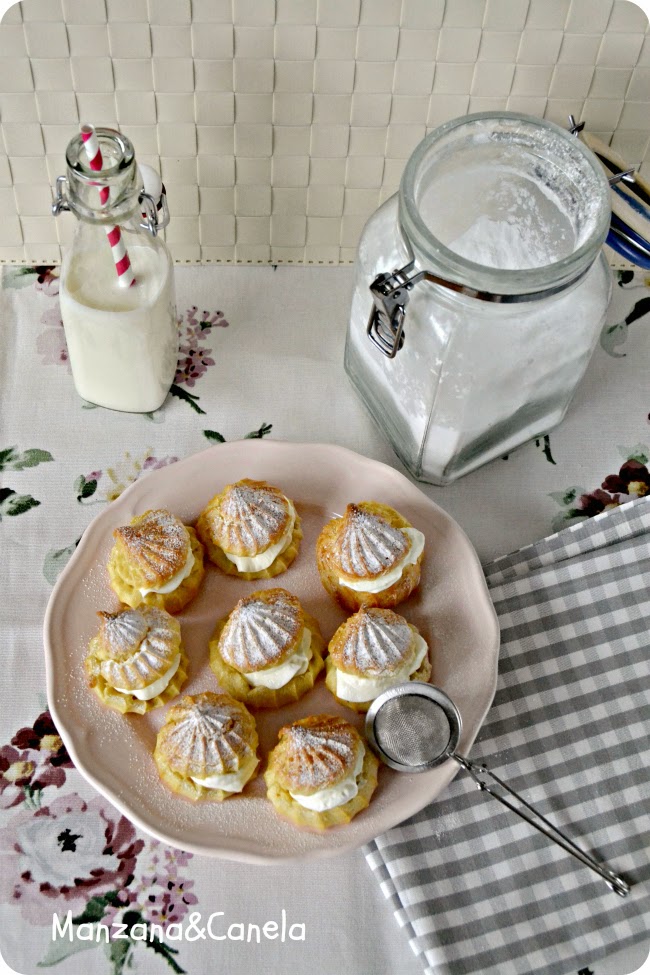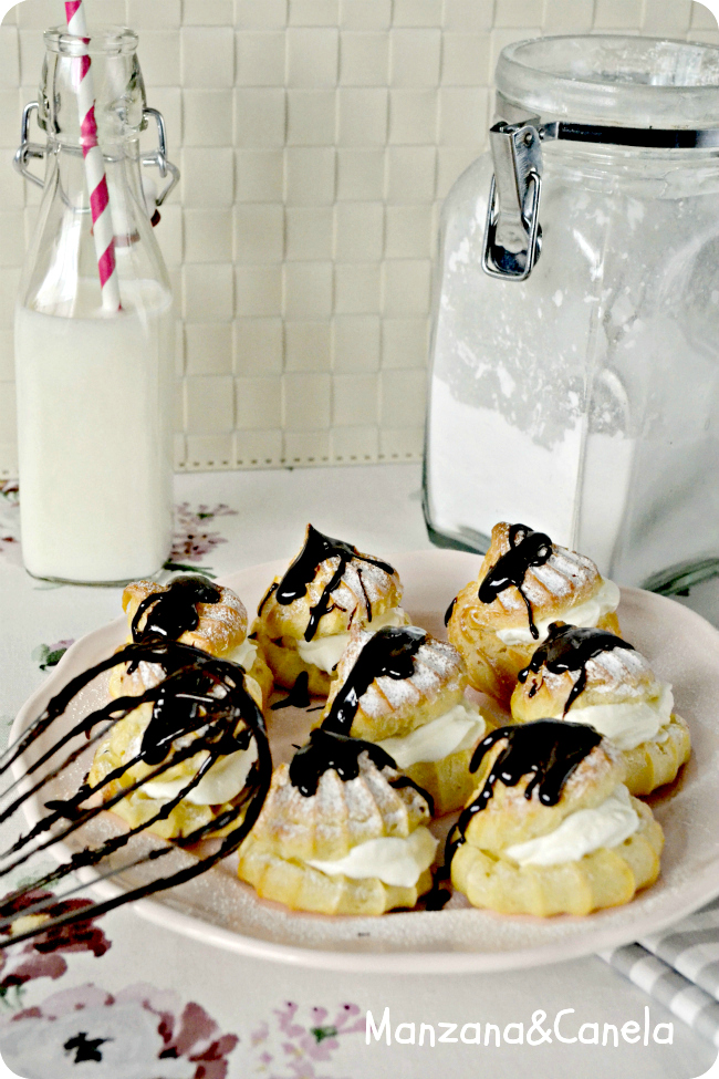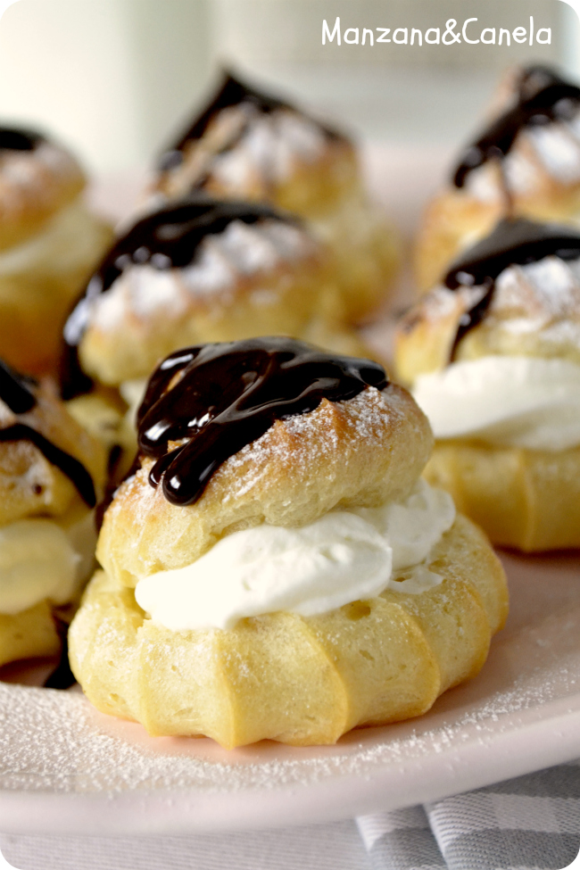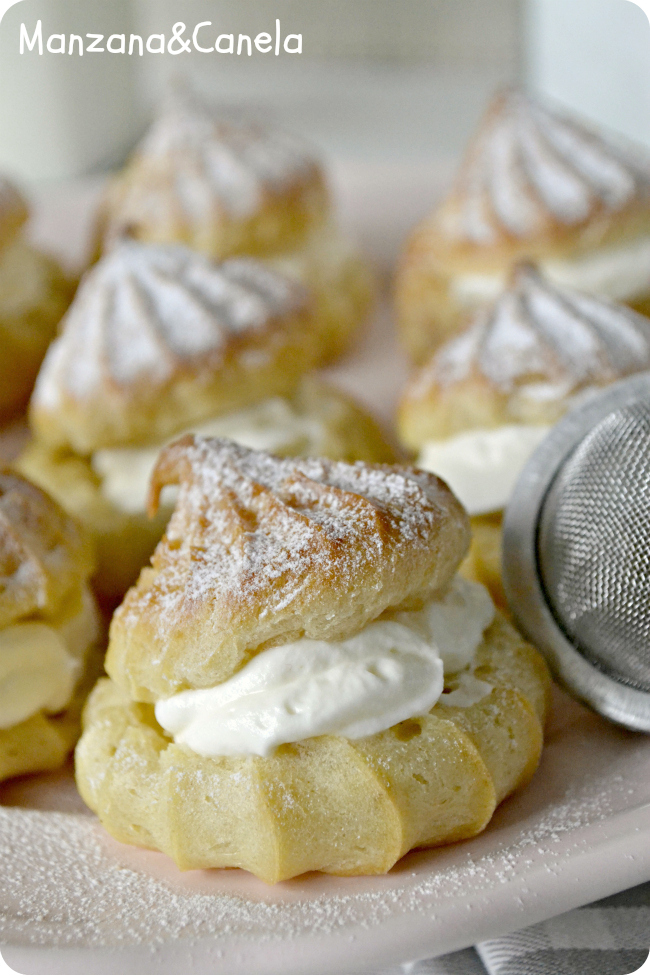 Estos bocaditos de nata en realidad no son más que pequeños pasteles hechos de una masa, llamada choux, básica en la repostería francesa. Muchos conocidos pasteles se elaboran con ella: profiteroles, éclairs… Se pueden rellenar de algo dulce o de algo salado, pero desde luego ya sabéis cuál es mi opción favorita…
