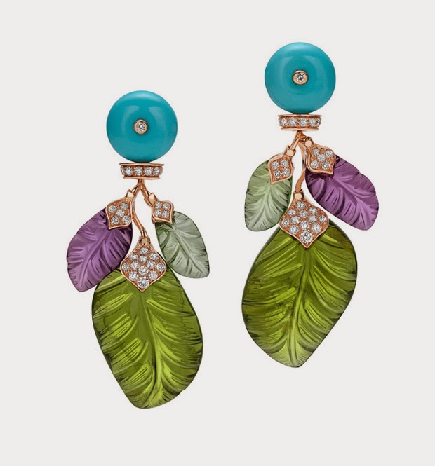 la casa italiana Bvlgari ha creado su colección Las Cuatro Estaciones a la que pertenecen estos pendientes de oro rosa con turquesas, diamantes y turmalinas, amatistas y peridotos en dos tonos verde tallados artesanalmente con forma de hojas.