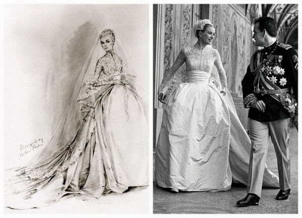 La actriz que se convertía en Princesa tras su boda con Rainiero III de Mónaco, como en una historia de amor ‘made in Hollywood’, vestía para el enlace un impresionante modelo de cuerpo ajustado con cuello alto y mangas largas realizado en encaje de puntilla rosa de Bruselas de 125 años de antigüedad, con una amplia falda globo de tafetán de seda, que marcaba la cintura de la Princesa con un fajín. En cuanto a los detalles, Grace Kelly llevó un bouquet de lirios y una tiara decorada en flores de azahar, tallada en brillantes y perlas que servía para sujetar un velo de 90 metros de tul de seda.