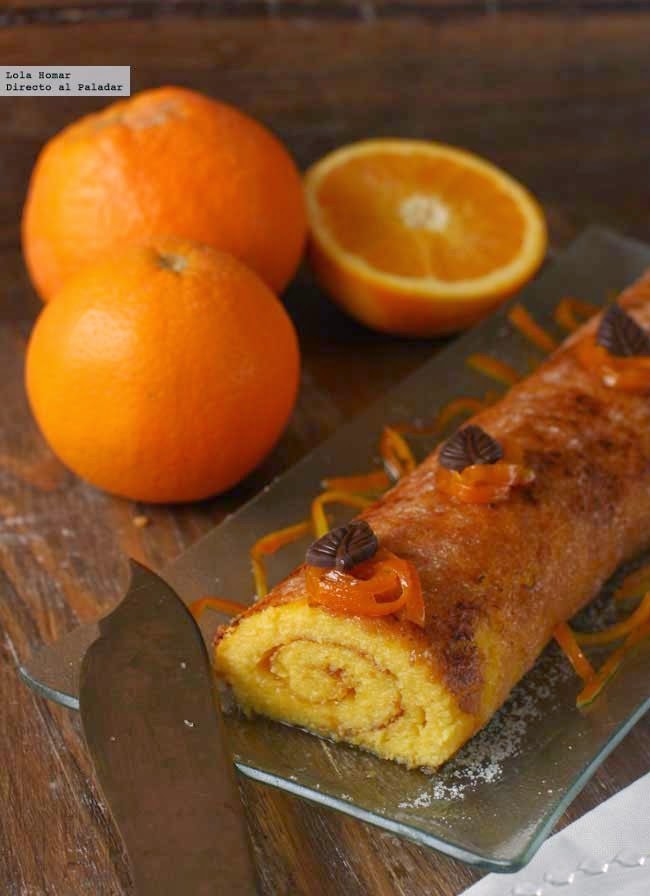 A mi me gusta quemar ligeramente el azúcar de la superficie del brazo de naranja con un soplete. Para decorar se pueden poner unas rodajas de naranja, unas rosetas de nata montada o merengue, o como he hecho en esta ocasión, unas tiras de naranja confitadas y unas hojas de chocolate. El brazo de naranja será un estupendo postre, pero me parece sobre todo apropiado para acompañar un café de media tarde.