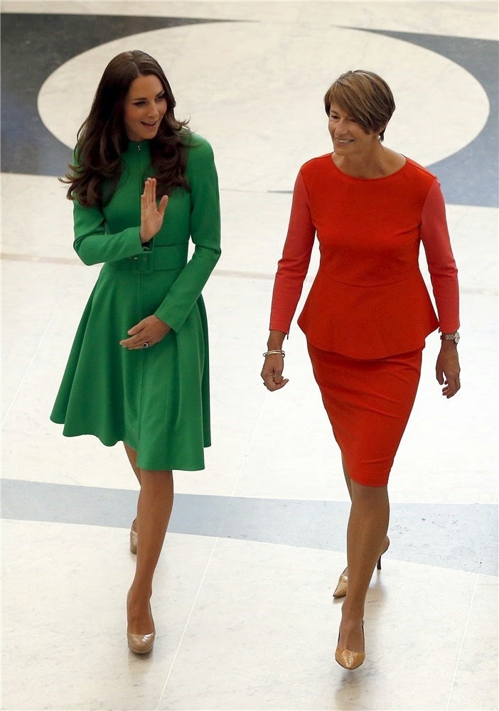 Los Duques de Cambridge continúan su visita oficial por Australia junto con el pequeño príncipe Jorge. Durante su visita a la ciudad de Canberra, Kate Middleton lució un diseño verde firmado por Catherine Walker combinado con unos tacones beige de LK Bennett.