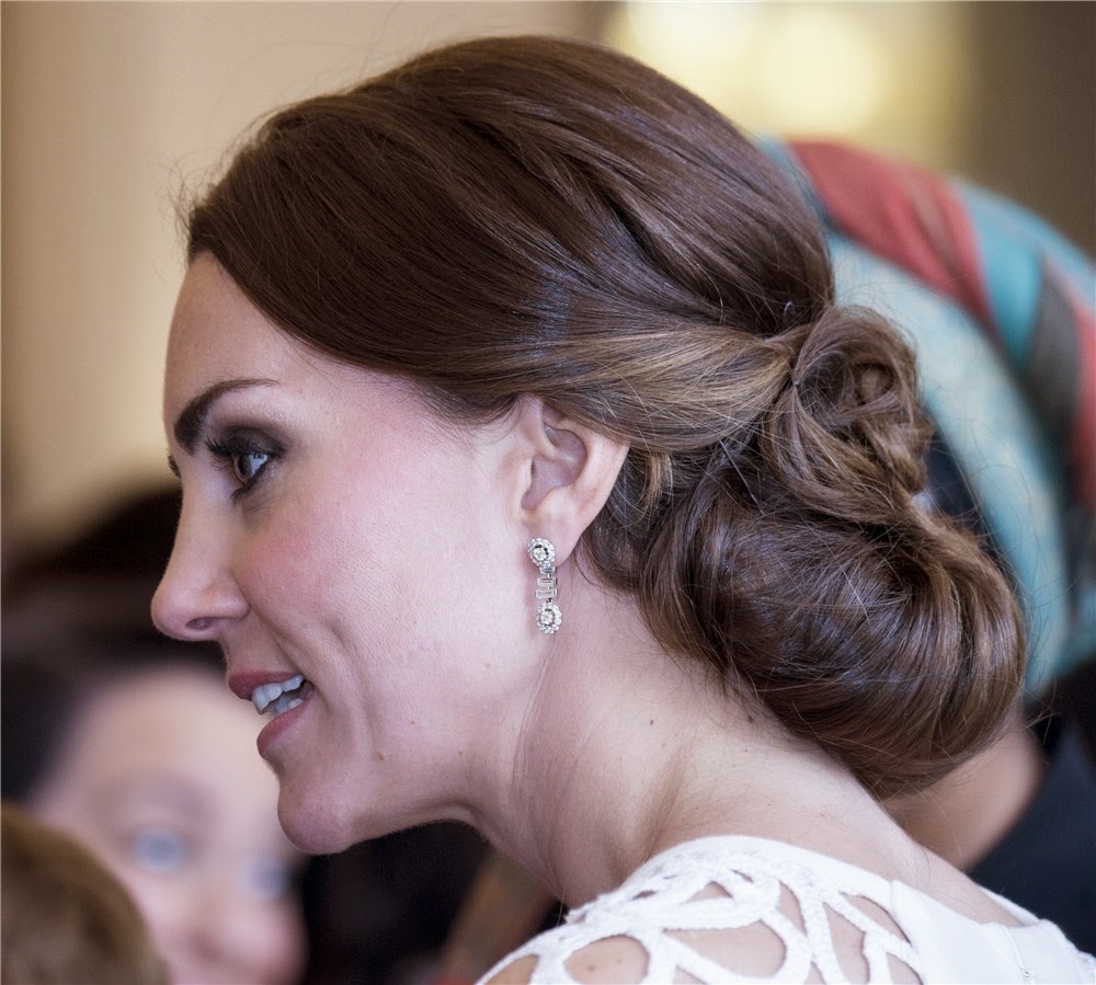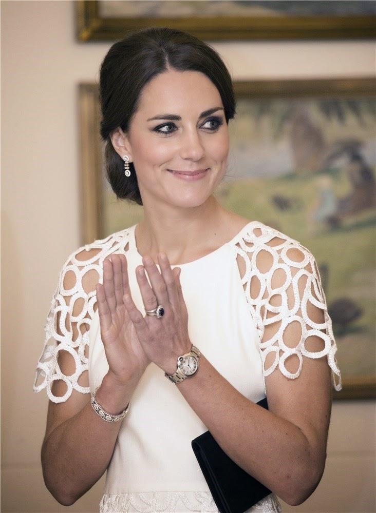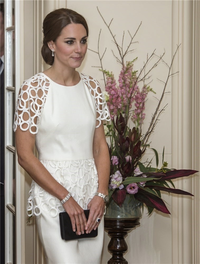 La Duquesa de Cambridge se decantaba por un modelo de cóctel en blanco con originales mangas perforadas, que ha combinado con salones negros y clutch a juego, y exclusivas joyas de diamantes que acompañaban a su anillo de pedida de zafiro. Kate Middleton ha lucido un recogido bajo de estilo retro y un maquillaje muy natural.
