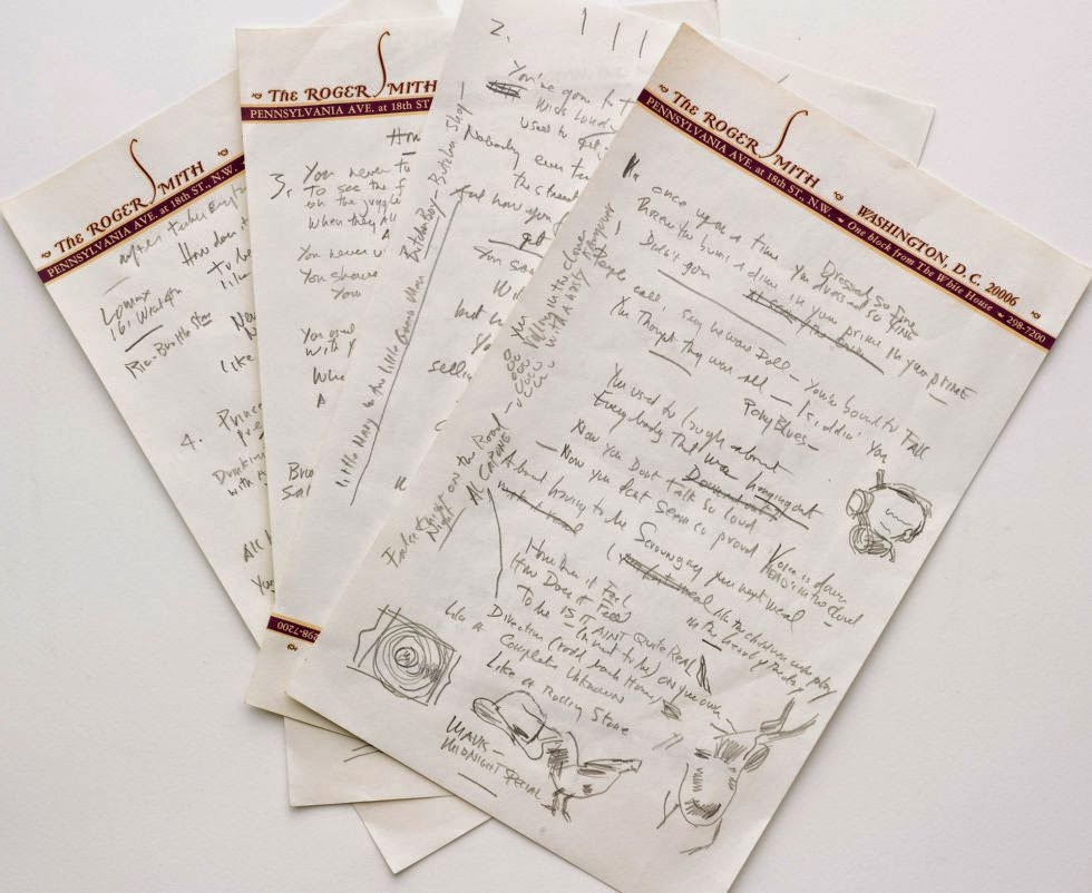 La letra de está última, sacada de un cuaderno de espiral, está prácticamente acabada, mientras que los folios que contienen Like… están en un estadio muy anterior y llenos de anotaciones. El mismo Dylan ha contado en más de una ocasión que el parto de Like a rolling stone, fue largo y costoso, que fue la canción que le animó a continuar cuando tras la gira por Reino Unido que dio lugar al documental Don´t look back, estuvo a punto de abandonar. «Había dejado de cantar y tocar, literalmente, y me encontré escribiendo esta canción, esta historia, esta larga pieza de vómito de cerca de veinte páginas, y de ella salió Like A Rolling Stone, y la hice single. Y yo nunca había escrito nada parecido antes y de repente se me ocurrió que eso era lo que debía hacer, ya sabes. Quiero decir, nadie había hecho eso antes», dijo en una entrevista en 1966.