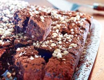 Dejar enfriar, cortar en cuadrados y espolvorear con cacao y almendra.