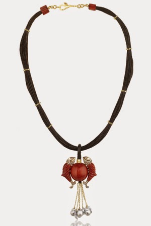 | Fruitfulness. Collar de oro amarillo, brillantes blancos y brown, perlas barrocas y mostacilla, y madera UmGoloty. |
