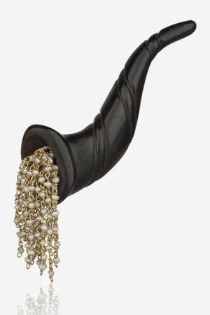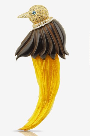 | El pájaro. Broche de oro amarillo, brillantes blancos y azul, perlas mostacilla, cuerno de búfalo de África y plumas de faisán dorado. |