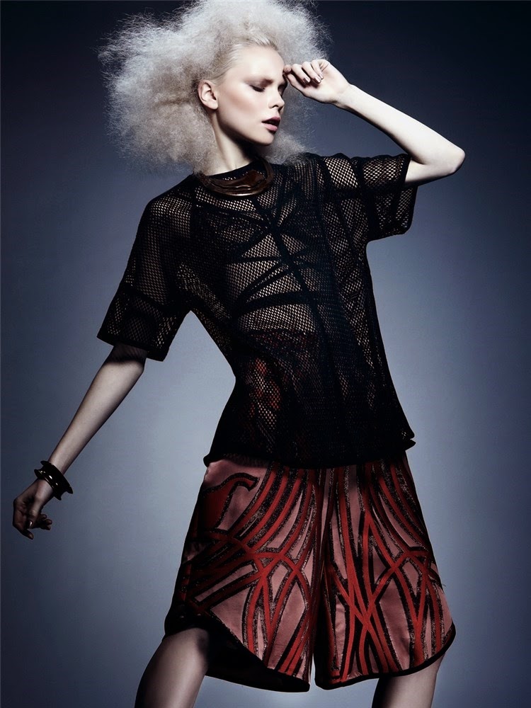 | Conjunto de Gucci, de camiseta de rejilla con pantalón estampado. El collar y la pulsera son de Joaquín Berao. |