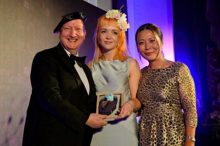 | Lucy Gardner, ganadora del LYCRA® Future Designers Award 2013 (medio), con Denise Sakuma de INVISTA (derecha) y el diseñador Stephen Jones (izquierda)