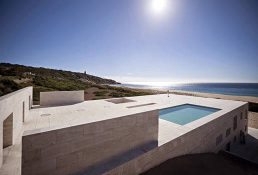 Los clientes son un matrimonio belga, él empresario y ella arquitecta, que acudió a Campo Baeza esperando una de sus viviendas blancas construidas en Andalucía. A lo mejor pensaban en la Casa Guerrero, una caja ensimismada en mitad de un campo de cultivo junto a Vejer de la Frontera, también en Cádiz, no muy lejos de su playa. Pero en la vivienda que mostramos correspondía otro color, el de la arena, que lo proporciona el mármol travertino romano que compone la fachada y que también alude a las cercanas ruinas de Bolonia. «Intento entender los sitios antes de nada. No impongo una arquitectura abstracta, cruel y dura», defiende Campo Baeza. En zonas con un entorno agresivo se decanta por proyectos más introvertidos. Cuando hay un paisaje que aprovechar, surgen sus poéticos miradores al infinito.