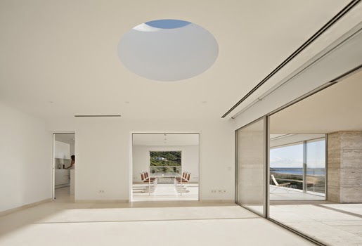 Los clientes son un matrimonio belga, él empresario y ella arquitecta, que acudió a Campo Baeza esperando una de sus viviendas blancas construidas en Andalucía. A lo mejor pensaban en la Casa Guerrero, una caja ensimismada en mitad de un campo de cultivo junto a Vejer de la Frontera, también en Cádiz, no muy lejos de su playa. Pero en la vivienda que mostramos correspondía otro color, el de la arena, que lo proporciona el mármol travertino romano que compone la fachada y que también alude a las cercanas ruinas de Bolonia. «Intento entender los sitios antes de nada. No impongo una arquitectura abstracta, cruel y dura», defiende Campo Baeza. En zonas con un entorno agresivo se decanta por proyectos más introvertidos. Cuando hay un paisaje que aprovechar, surgen sus poéticos miradores al infinito.