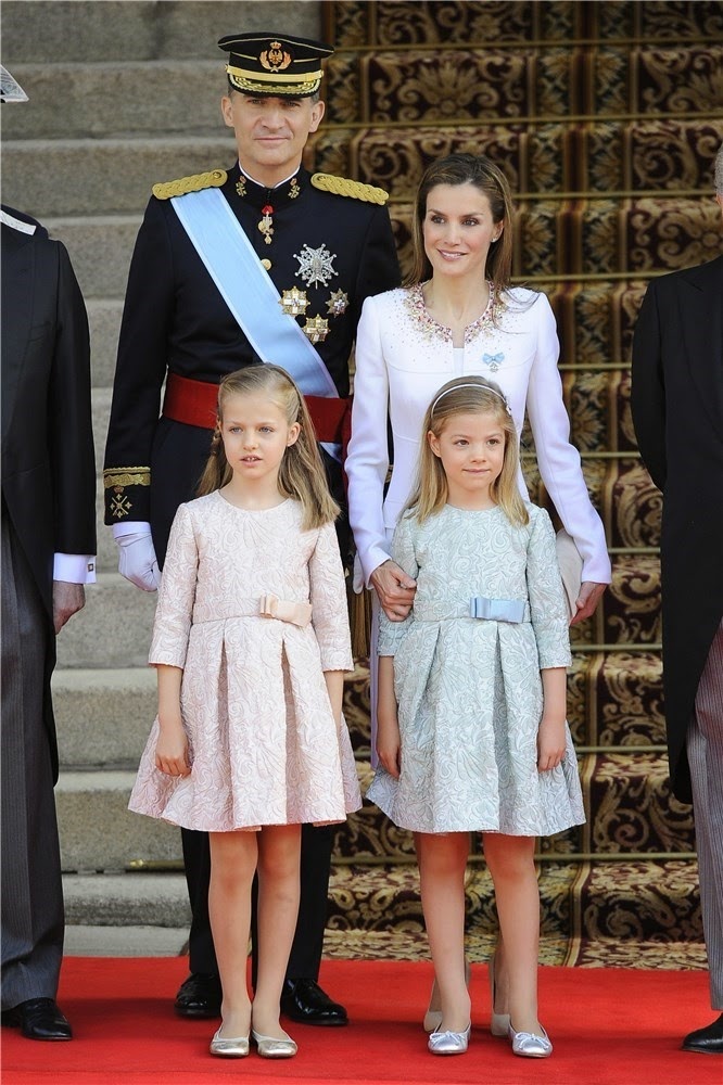 Si ayer veíamos a las Infantas con dos veraniegos vestidos en blanco y rosa de la firma gallega Nanos en el Palacio Real durante la firma a la ley de abdicación, para el acto de proclamación han elegido dos diseños iguales brocados con lazo en un lateral, cada una de un color.