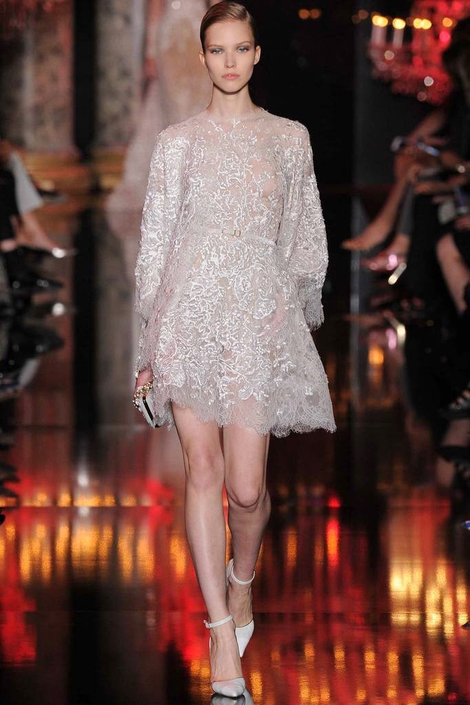 ¡Denim! Ese no es tejido para la Alta Costura de Saab donde hubo incluso vestidos cortos, con volantes para los cócteles y las fiestas nocturnas. Y un par de trajes casi transparentes sugirieron una medianoche risqué.
