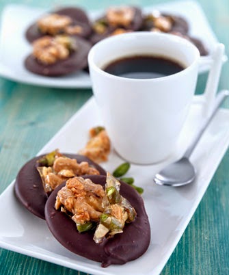 Coger un poquito de chocolate en la lámina de un cuchillo. Si se endurece de forma homogénea y tiene un poco de brillo está listo. Lllenar una manga pastelera con boquilla fina con este chocolate. Formar 10 círculos de tamaño similar sobre un silpat o una placa forrada con papel vegetal. Poner los frutos secos caramelizados encima del chocolate (trabajar rápidamente para que no se endurezca el chocolate y los frutos secos se hundan un poco). Dejar que se seque y guardarlos en un envase bien tapado sin apilarlos.