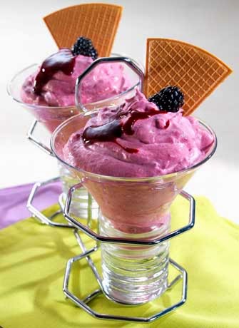 En el momento de servir la mousse, decorarla por encima con una mora y un chorrito de salsa y con un barquillo.