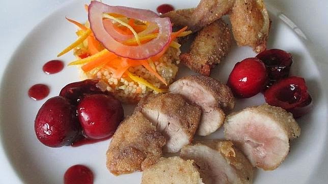 Limpias y descuartizadas las codornices necesarias, pasen muslos y pechugas por harina fuerte y háganlos en la sartén, dejandocurruscantes los primeros y jugosas en su interior las segundas. Deshuesen las cerezas y, en una sartén pequeña, pónganlas con un poco de mantequilla y un chorrito de kirsch. Háganlas un par de minutos, para evaporar el alcohol y caramelizar un poco los jugos, y sírvanlas con las codornices. Un bocado, literalmente, para Lúculo.
