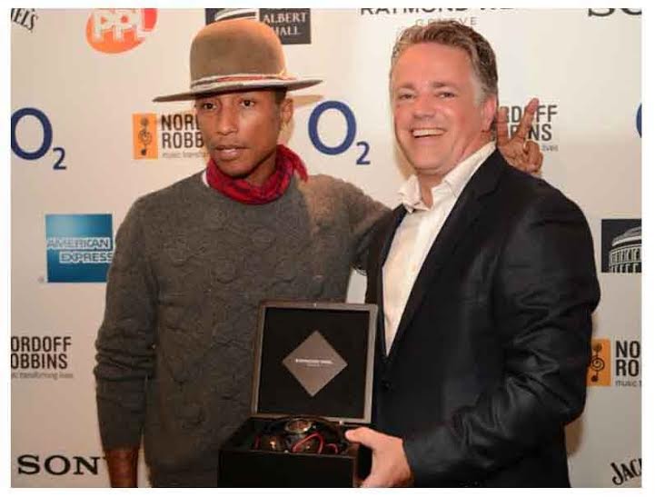 Pharrell estaba en persona para recibir en mano el premio RAYMOND WEIL que entregó Craig Leach, Brand Director de RAYMOND WEIL Reino Unido en el evento estelar a la que asistieron algunos de los nombres más grandes en el negocio de la música como: Jimmy Page, Sir Tom Jones, Black Sabbath, Chas & Dave, Paloma Faith, Giorgio Morodor, Laura Mvula, Gaby Roslin y Gareth Malone.