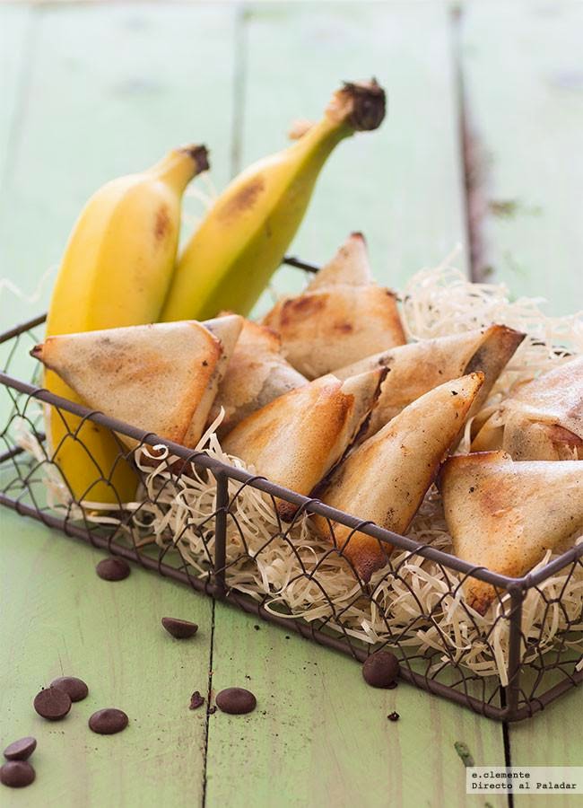 Cortamos las láminas circulares de pasta brick a la mitad, consiguiendo dieciseis medias circunferencias. Añadimos en una esquina de la pasta una parte proporcional de relleno de plátano y unas perlas de chocolate negro, teniendo en cuenta que nos van a salir dieciséis unidades.Doblamos como explico en las imágenes del paso a paso y seguidamente haciendo un triángulo, que giraremos consecutivamente conservando el relleno cerrado en el interior.