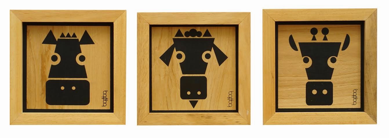 Los Papinos pertenecen a una edición limitada de cuadros con estampas en serigrafía manual, marcos en madera marupá y fondos de cartón recuperado. Pensados para decorar habitaciones infantiles o salones de juego, los modelos con dibujos originales de Bacba, incluyen diseños de animales, peces, pajaritos y otros personajes de la naturaleza. Entre sus diez variedades, con fondo de madera y un tamaño de 15 cm x 15 cm, también ofrecen un dúo de cuadritos con ilustraciones de cupcakes y cafetera para darle un toque de distinción a la cocina.