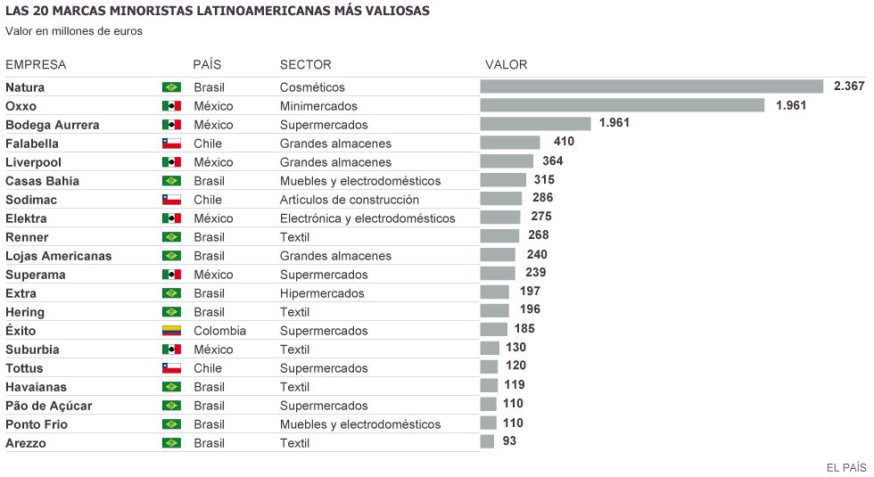 La visita de las grandes marcas internacionales no sorprende y lo mismo sucede en otros países del continente. En la última edición de la clasificación mundial que hace la consultora A. T. Kearney sobre los países más atractivos para los negocios minoristas, Chile encabeza la lista, seguido de Brasil. Otros países de la región que también entran entre los 25 primeros son Uruguay, Perú, Panamá y Colombia. Estos países tienen en común su estabilidad económica, su apertura y el fortalecimiento de sus clases medias. Según el Banco Mundial, unos 49 millones de latinoamericanos escalaron a la clase media entre 2003 y 2009. Este organismo calcula que para 2030 el 42% de la población de la región será de clase media, 10 puntos porcentuales más que en los últimos años.