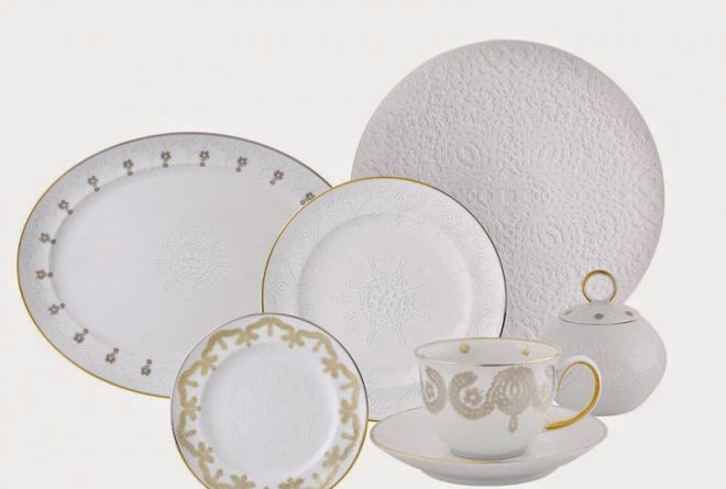 Los bajoplatos y platos de pan, hechos en biscuit, incorporan la decoración en relieve aportando una textura muy marcada.