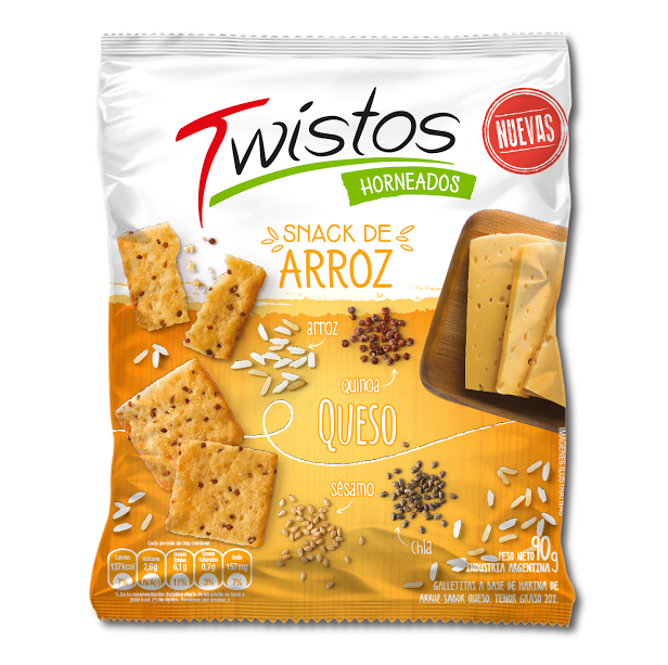 Twistos® Snack de Arroz ya está disponible en packs de 90g, en dos sabores, Original y Queso, y se puede encontrar en supermercados y autoservicios del país.