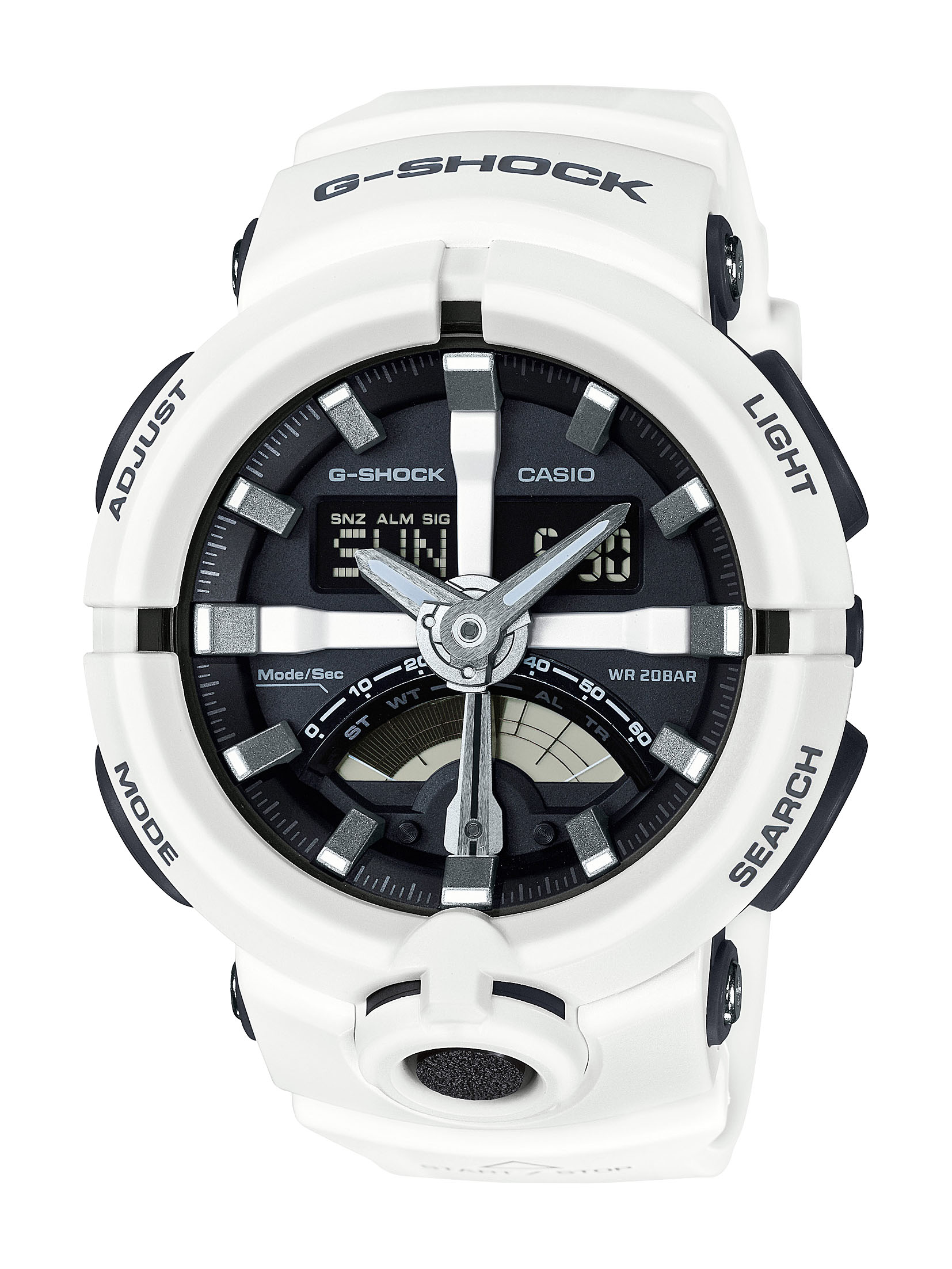 El GA-500-7A de G-SHOCK no solo se destaca por su diseño en blanco y negro, mismos colores de los clásicos soldados imperiales “Stormtroopers” de Star Wars. También se trata de un reloj ideal para amantes de los deportes como el ciclismo tienen un reloj ideal en el modelo Además de un diseño legible y atractivo, de cara ancha y redonda, este modelo se destaca por contar con una combinación analógico-digital de Casio equipada con grandes botones frontales a las 6 en punto. Una pulsación de un botón frontal mientras está en el modo de hora normal inicia inmediatamente una operación de cronómetro. La función Tiempo objetivo le permite especificar el tiempo que desea alcanzar para una actividad, lo cual es excelente para realizar carreras y otras aplicaciones.