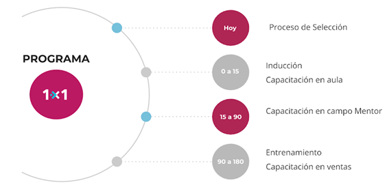 El “Programa 1×1” está planteado en distintas fases: Selección, Inducción y capacitación en aula, Capacitación en campo Mentor, Entrenamiento y capacitación en ventas.