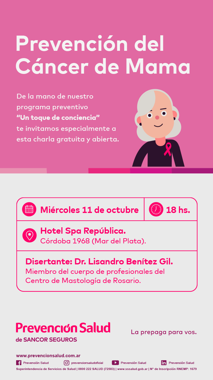 Mar del Plata, octubre de 2023.- En el mes de Sensibilización sobre el Cáncer de Mama, y de la mano del programa “Un toque de conciencia”, Prevención Salud –la prepaga de SANCOR SEGUROS– dará una charla gratuita y abierta a la comunidad en la ciudad de Mar del Plata que tendrá como disertante al Dr. Lisandro Benítez Gil, miembro del cuerpo de profesionales del Centro de Mastología de Rosario.