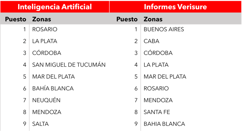 Como se observa en los listados anteriores, se encuentran coincidencias y disidencias entre la información brindada por la multinacional y la IA. Ambas coinciden en que Córdoba ocupa el tercer lugar entre las zonas más inseguras, y lo mismo sucede con Mar del Plata. Sin embargo, en el caso de Rosario, La Plata, Bahía Blanca y Mendoza, cambian de puesto según la fuente consultada. Teniendo en cuenta que Verisure Alarmas recopila información a partir de su porfolio de clientes, las diferencias pueden deberse a las disparidades en los universos de estudio.