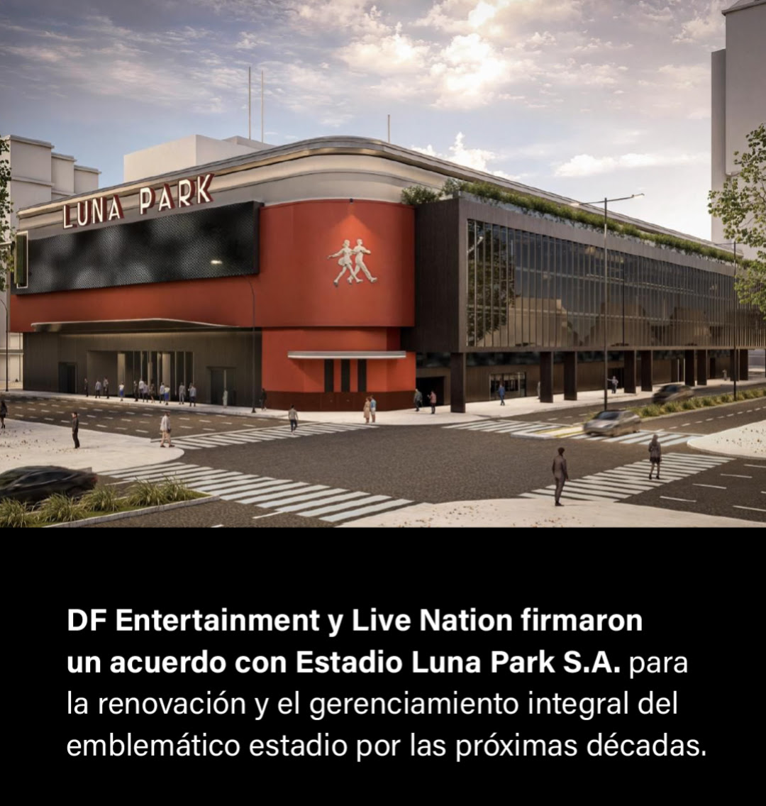 DF Entertainment y Live Nation liderarán la renovación del Luna Park con una reapertura prevista para fines de 2027, marcando el inicio del camino hacia su centenario en 2032. La obra aumentará su capacidad y conservará su emblemática fachada y elementos arquitectónicos originales, reafirmando su identidad como uno de los lugares más reconocidos del mundo. DF Entertainment–Live Nation fue seleccionado por Estadio Luna Park SA a través de un proceso de selección privado, en el que participaron los principales actores del mercado.