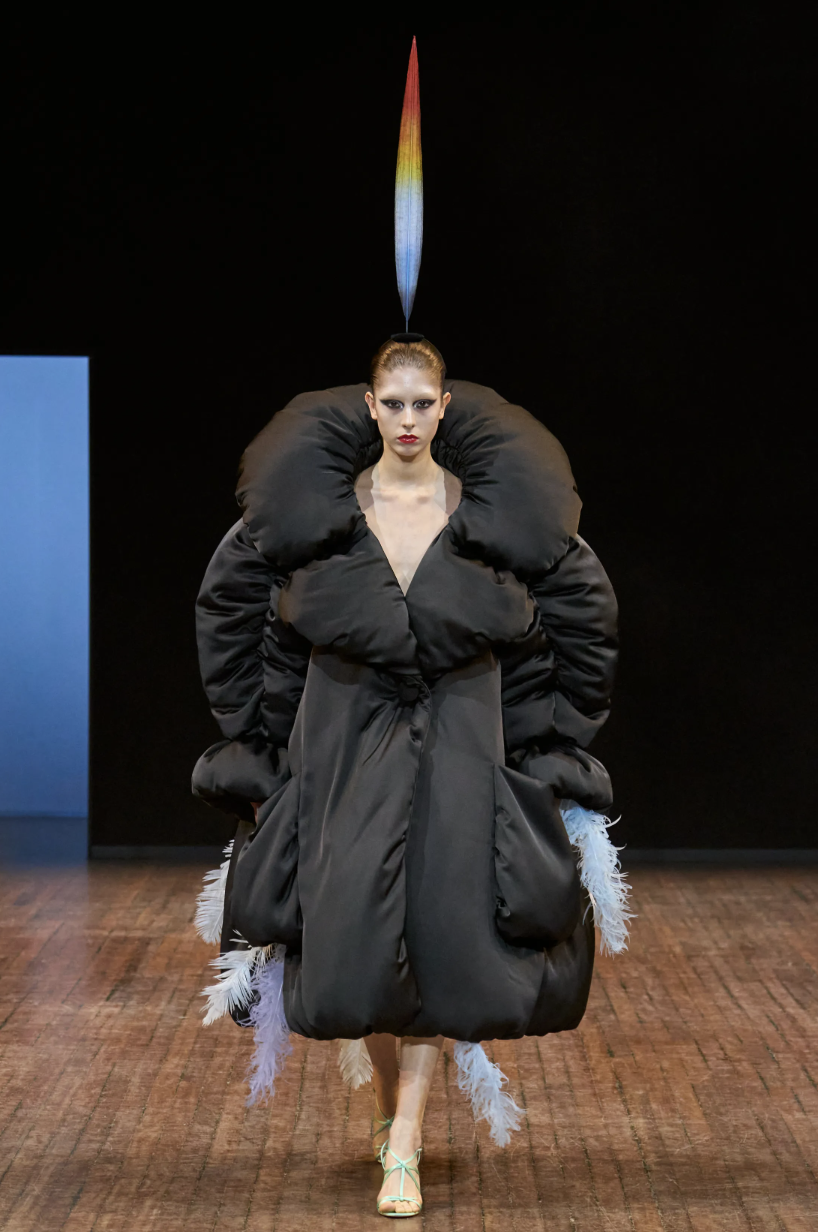 Todo parece estar en movimiento: pliegues que se inflan y desinflan, estructuras que suben y bajan simultáneamente, tocados que levitan como plumajes en espiral. Las plumas regresan con fuerza, dispuestas en hileras verticales o flotando sobre las cabezas como si fueran parte del vestuario de una ópera cósmica.