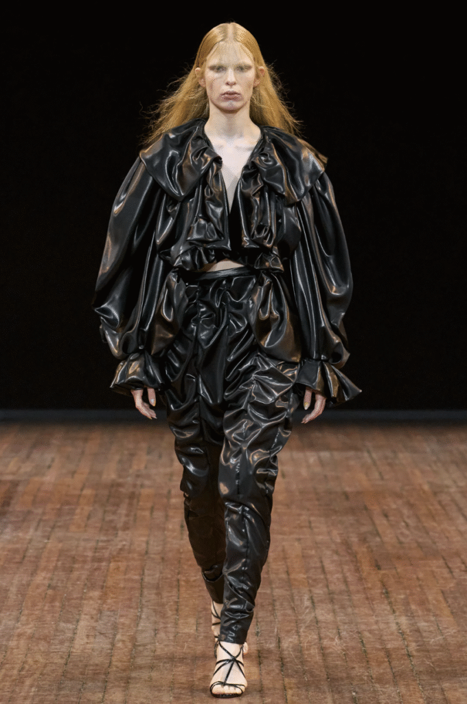 Los vestidos, algunos con peso evidente en la caída, revelaban una teatralidad pausada, mientras otros apostaban por la ligereza de las capas vaporosas y los cuellos fruncidos que dotaban a las modelos de un aire casi clerical, elevado, sagrado.