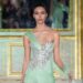 Las texturas brillantes y los destellos minúsculos terminaban de construir este universo de alta fantasía. Lentejuelas ocultas bajo transparencias, bordados finísimos y acabados que reaccionaban a la luz como estrellas en movimiento hacían de cada look una escena por sí misma.