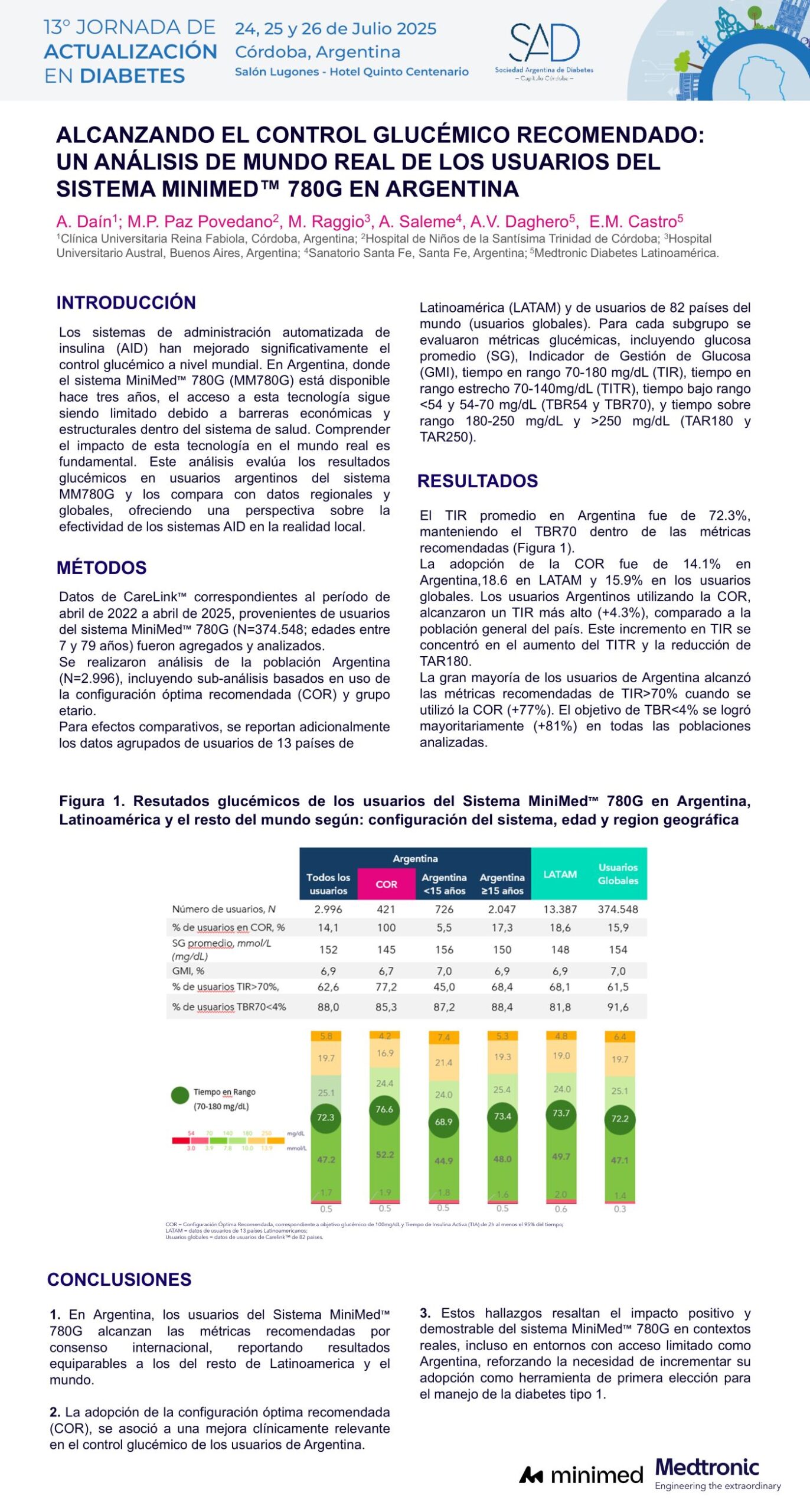 Los datos fueron recolectados desde CareLink, plataforma virtual automatizada utilizada por usuarios del sistema MiniMed™ 780G, y forman parte de un análisis regional que incluye también datos de Latinoamérica y usuarios globales. El estudio fue desarrollado por especialistas de hospitales argentinos y del equipo de Medtronic Diabetes LATAM, con representación local e internacional.