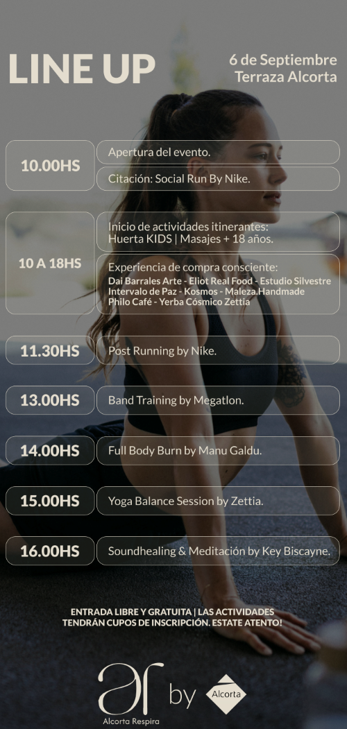 Alcorta Respira tendrá una ubicación única y privilegiada: la terraza de Alcorta. Las personas presentes podrán descubrir este increíble espacio del shopping, ubicado en el cuarto nivel accediendo por la rampa del estacionamiento. Allí encontrarán un espacio creado especialmente para vivir una grilla completa y super variada de clases y actividades guiadas por reconocidas personas dentro del universo del Wellness y del Deporte Consciente. Es así como veremos al grupo Running de Nike encabezar la primera actividad de la jornada, seguido por una clase de Band Training a cargo de Megatlon, a Manu Galdurralde junto con Nike con la clase de Full body burn, a Sofia Calzetti y su marca Zettia con una clase de Yoga Balance de la mano de Cami Riganti y, para terminar, con Nicolás Cuneo de Key Biscayne en una clase de meditación con el método Soundhealing. Cada clase requiere inscripción previa a través de ¡appa!.