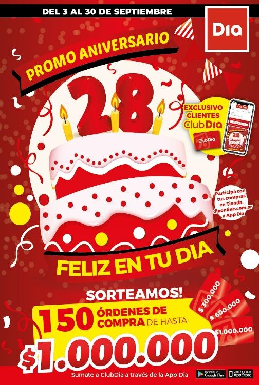 Buenos Aires, 28 de agosto de 2025.- Este mes de septiembre, es el 28° aniversario de Dia en Argentina y para celebrarlo con todos sus clientes, sortea 150 órdenes de compra de hasta 1 millón de pesos.