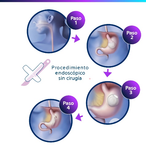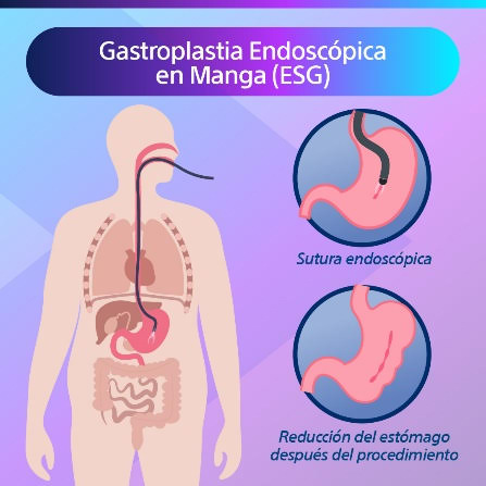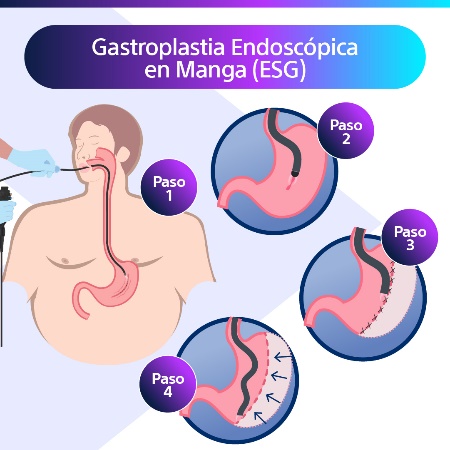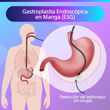 - ESG (Gastroplastia endoscópica en manga) : Procedimiento que consiste en reducir el tamaño del estómago (70/80%) frunciéndolo con 6 a 8 suturas endoscópicas, imitando el efecto de una manga gástrica. Esto limita la cantidad de alimentos que una persona puede ingerir, ayudando a controlar el apetito y promoviendo la pérdida de peso. Según estudios realizados, en un año un paciente pierde aproximadamente una media del 14% del peso corporal total, y una media del 49% del exceso de peso corporal.