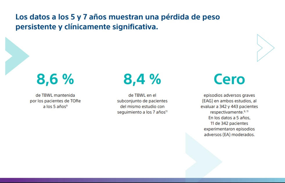 “El procedimiento endoscópico TORe ha mostrado significativamente menos episodios adversos en los pacientes tratados en comparación con alternativas quirúrgicas más invasivas” -revela el Dr. Rudolf Baron Buxhoeveden -. “Los datos a los 5 y 7 años muestran una pérdida de peso persistente y clínicamente significativa”.