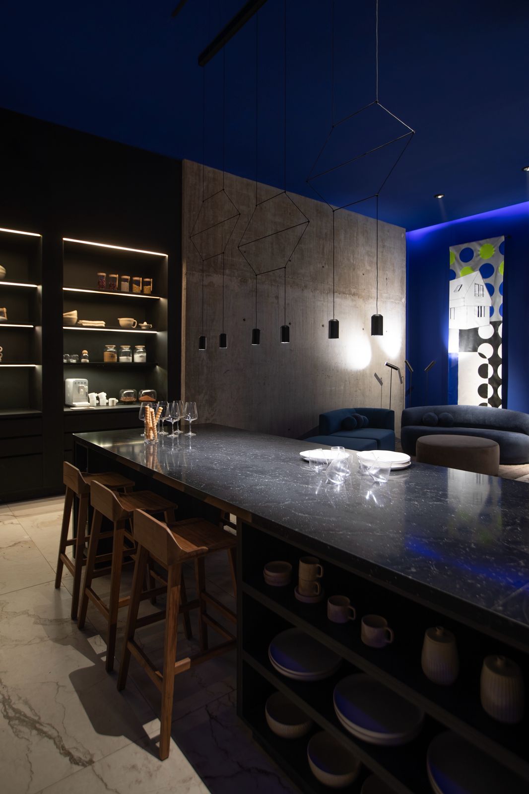 Asimismo, presenta el “Azul Puro™” como color tendencia para el año entrante. Este azul vibrante puede encontrarse como protagonista en este espacio y en otros, como por ejemplo, la cocina de encuentro de las arquitectas María Beatriz González Zuelgaray y Beatriz Palacios. En términos generales, el azul es un tono que provoca sensación de estabilidad, fluidez e inmensidad, el remedio para la vida frenética actual. Es también, aparentemente, el color favorito del mundo, por su conexión con el cielo sin nubes y las aguas relucientes. Un color asociado a la frescura, a la limpieza y a la calma.