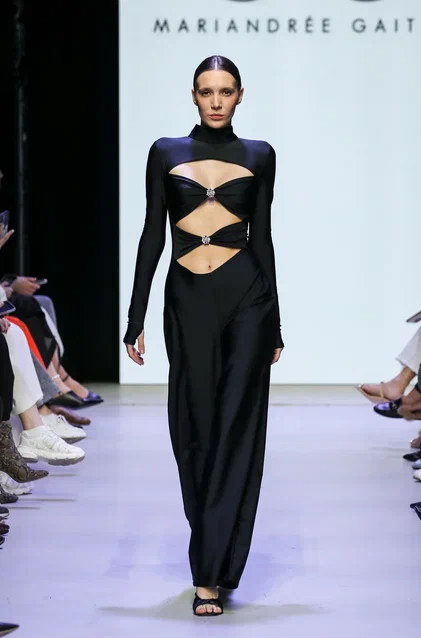 Otra estrella latinoamericana, Mariandrée Gaitán, de Guatemala, presentó una colección romántica y etérea. Suaves tonos pastel con delicados destellos de pedrería contrastaron con detalles en negro para crear un dramatismo teatral. Las piezas de piel ecológica, incluyendo un abrigo llamativo y maxivestidos, se adornaron con motivos florales y apliques tridimensionales.