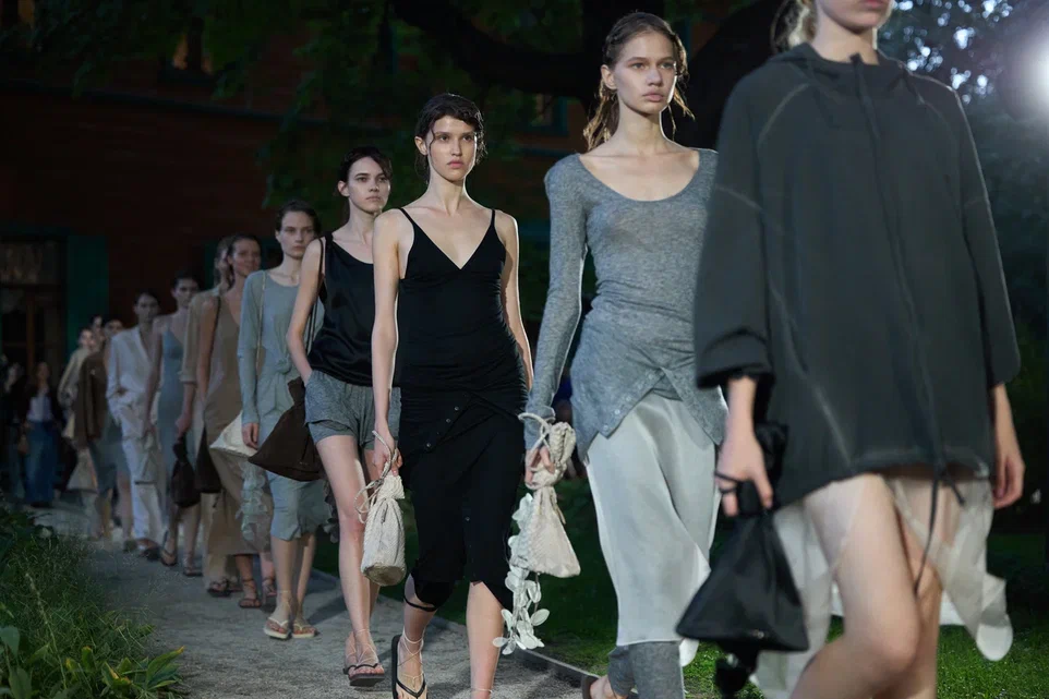 La colección de Gapanovich en MOSCOW FASHION WEEK fusionó la elegancia del ballet con la practicidad de la ropa deportiva, presentada en una paleta de tonos suaves acentuados por contrastes llamativos; las piezas están confeccionadas en tejidos grises, tafetán de seda y satén.