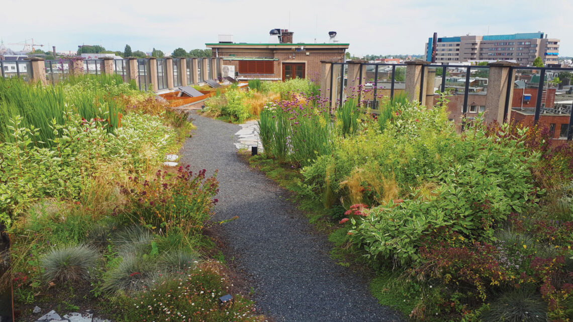 Los techos verde-azules combinan este sistema de reservorio de agua de lluvias con vegetación en los techos y terrazas, lo que trae múltiples beneficios: impulsa la biodiversidad, mantiene los edificios frescos durante olas de calor, ayuda a gestionar las lluvias extremas que son cada vez más frecuentes, y mejora la resiliencia al clima.