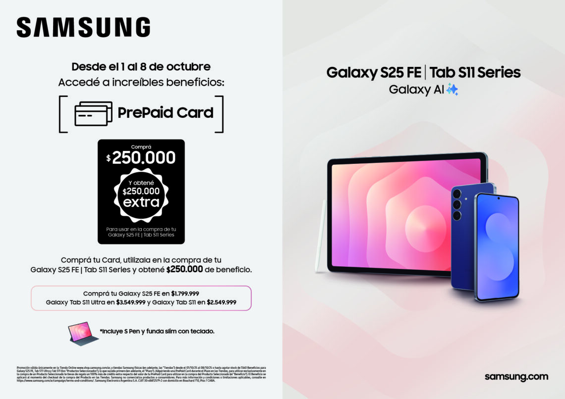 - Desde el 1 al 8 de octubre se podrá acceder a Samsung PrePaid Card para obtener un beneficio extra en la compra de un Galaxy S25 FE y Galaxy Tab S11 Series, que se comercializarán a partir del 9 de octubre en Argentina.