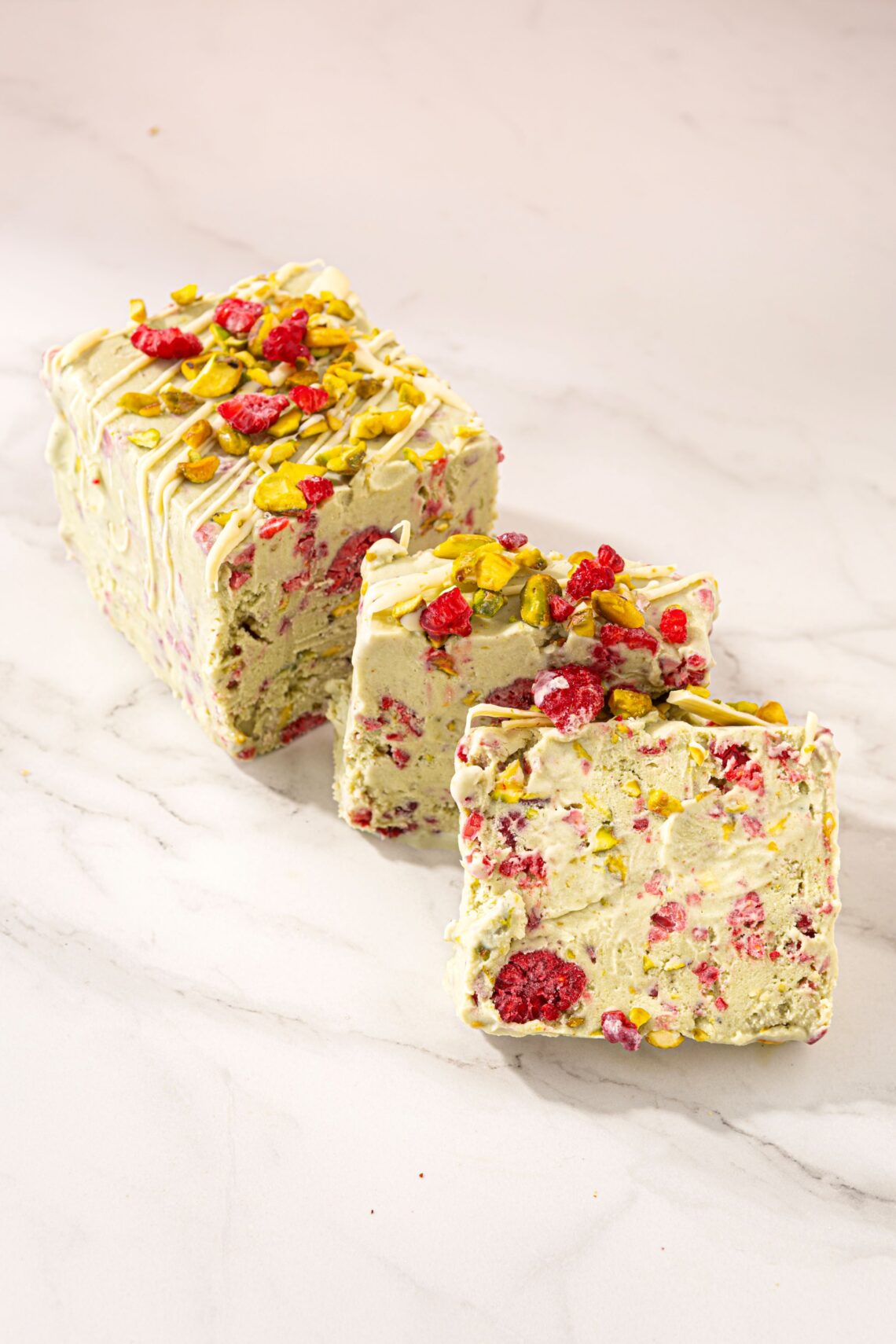 Preparado con helado de pistacho elaborado a partir de ingredientes 100% naturales y la exclusiva leche Jersey de Munchi’s, este postre despliega una textura sedosa y un sabor intensamente cremoso. En su interior, se combinan semillas de pistacho y frambuesas frescas, mientras que su exterior se viste con una delicada cobertura de chocolate blanco, frambuesas y trozos de pistacho.