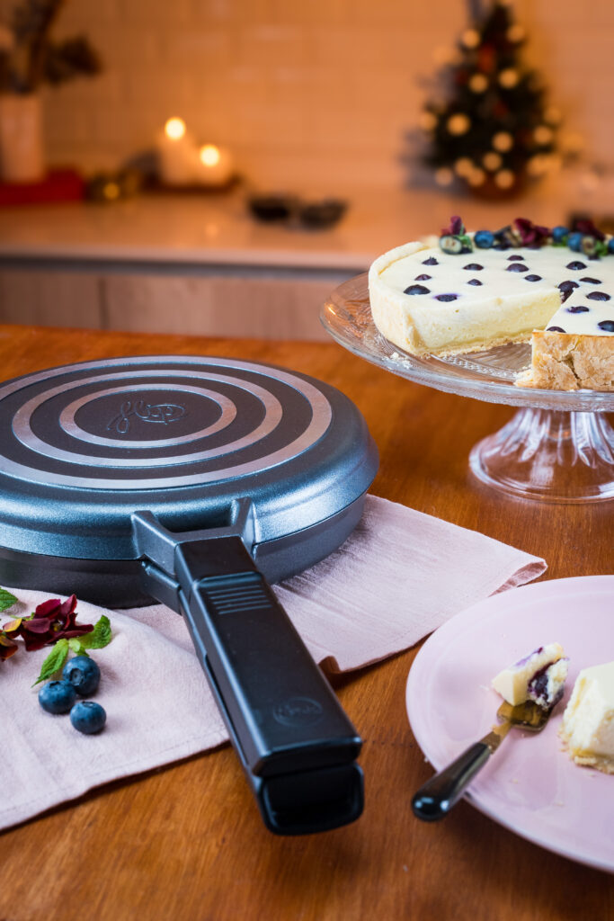 Mezclar el queso crema, los huevos, la harina y la crema de leche. Volcar sobre la masa en la Flip Nuit y colocar arándanos sobre la superficie. Cerrar y cocinar a Fuego Corona por 40 minutos. Decorar con mas arándanos, flores comestibles y servir.