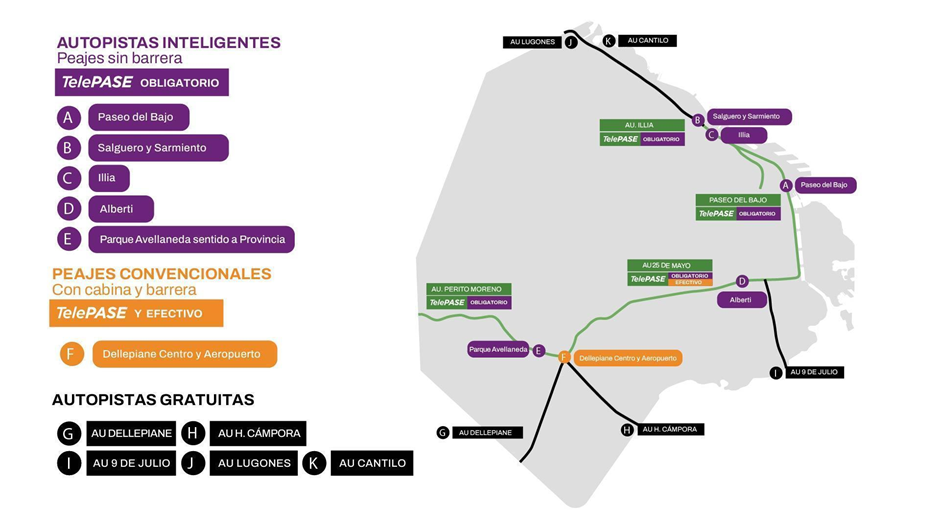 La transformación hacia peajes sin barreras (free flow) ya está en marcha desde hace tiempo: se estrenó para todo tipo de tránsito la AU. Paseo del Bajo en 2019, mientras que AU. Illia fue la primera autopista inteligente para tránsito liviano (2023); Peaje Alberti incorporó pórticos de cobro automático; y en 2024 el Peaje Parque Avellaneda sumó tres carriles con lectura automática. Además, desde julio está habilitado el pórtico de la AU. Perito Moreno, que reemplaza 30 cabinas, allí se podrá abonar en efectivo en cabinas habilitadas hasta noviembre de 2025.